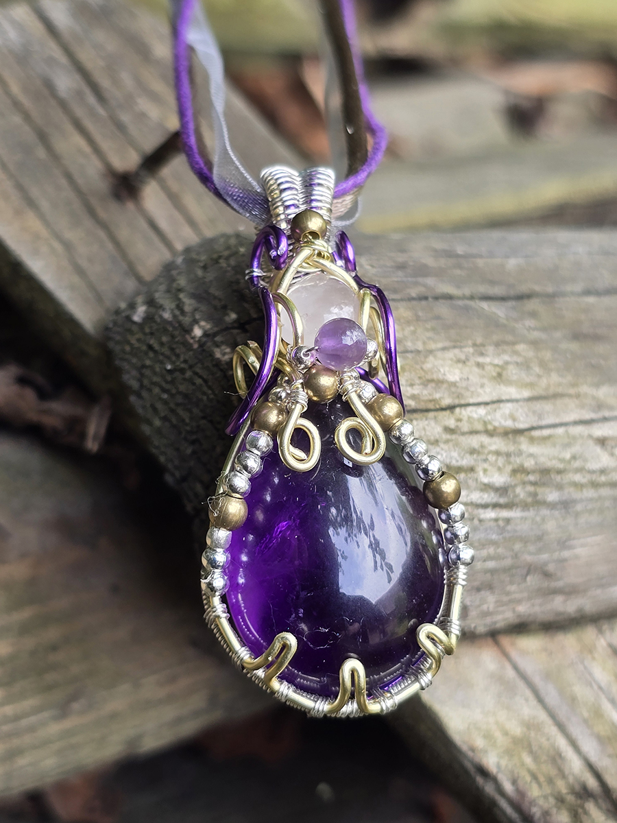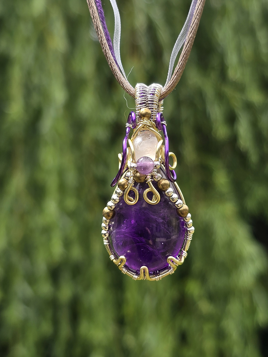 Cette belle améthyste dodue est montée en double avec un mini cabochon de quartz rose, dans une monture en cuivre doré, argenté et mauve, escorté de toute une cour de petites perles métallique et d'une petite améthyste ronde. Le cabochon principal fait un gros 3 cm de long, et le pendentif complet 5 cm.