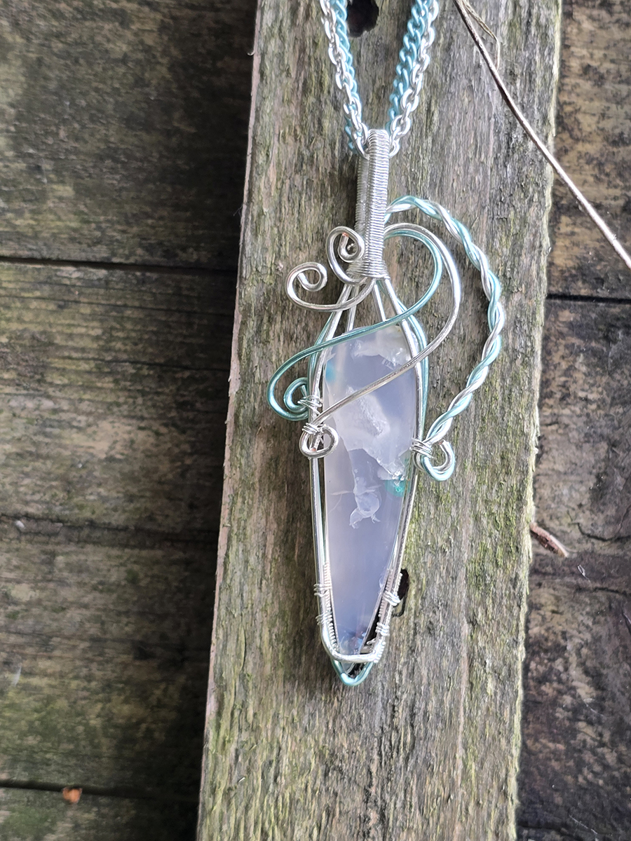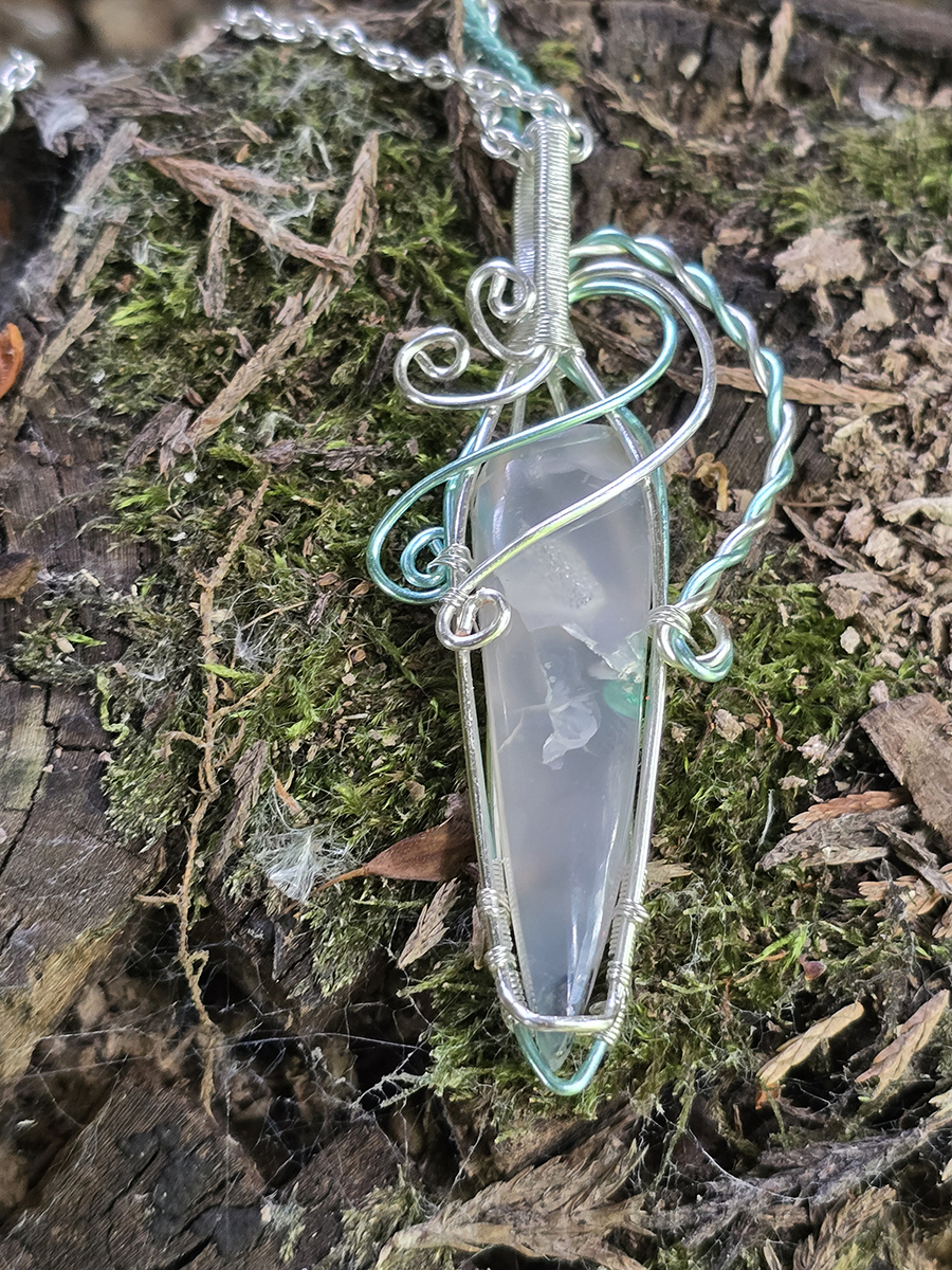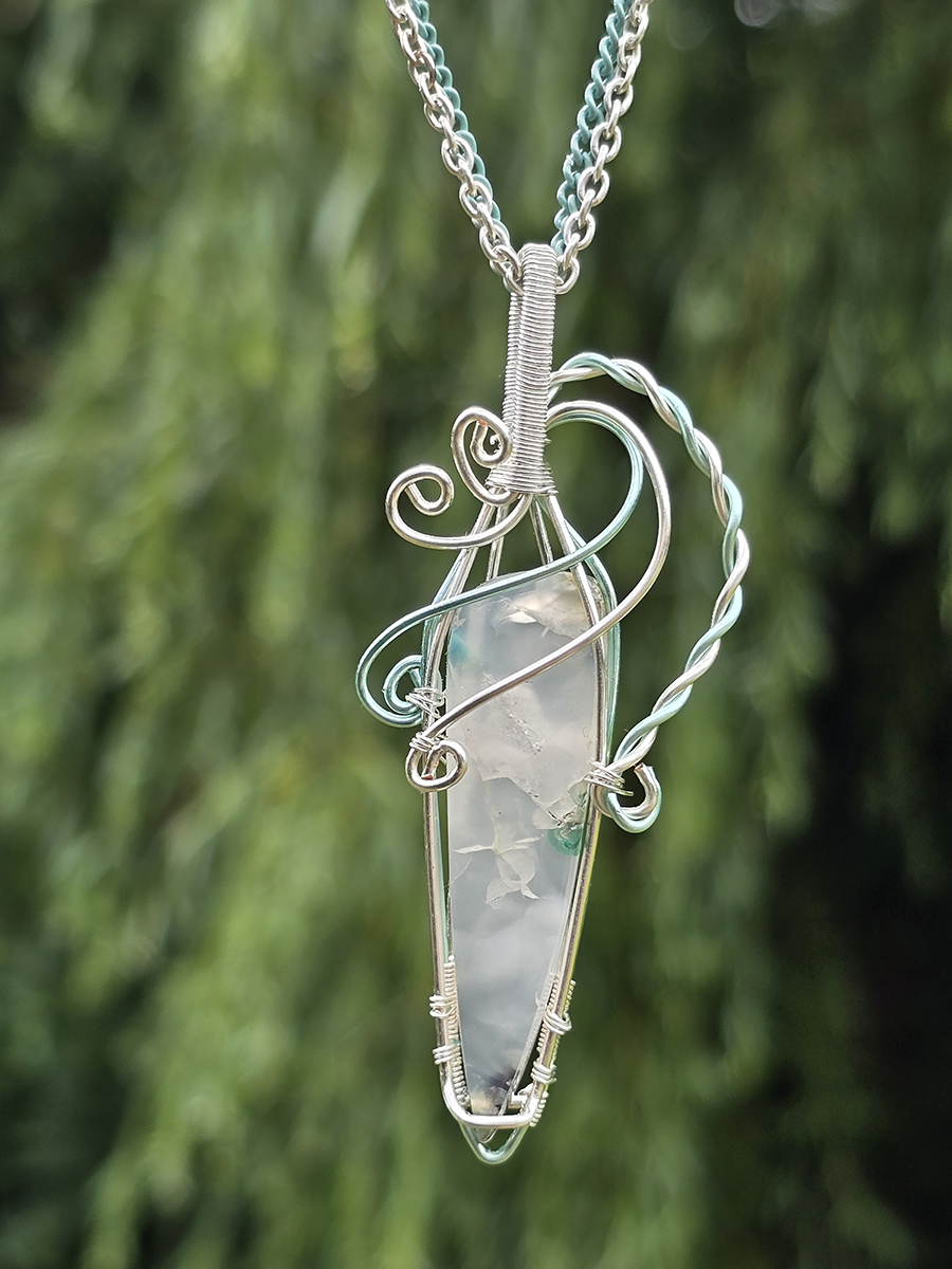 Très élégante, cette longue (plus de 4 cm) et étroite pointe d'agate avec ses touches vertes de chrysocolle et sa petite paillette de cuivre natif dans le bas. La monture en cuivre argenté et vert pâle porte le pendentif complet à presque 6 cm. Le collier est constitué de chaînettes argentées et vertes.
