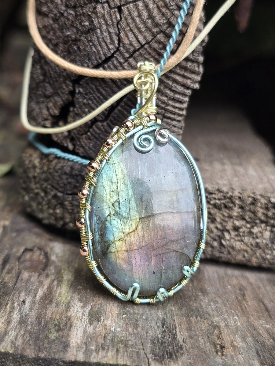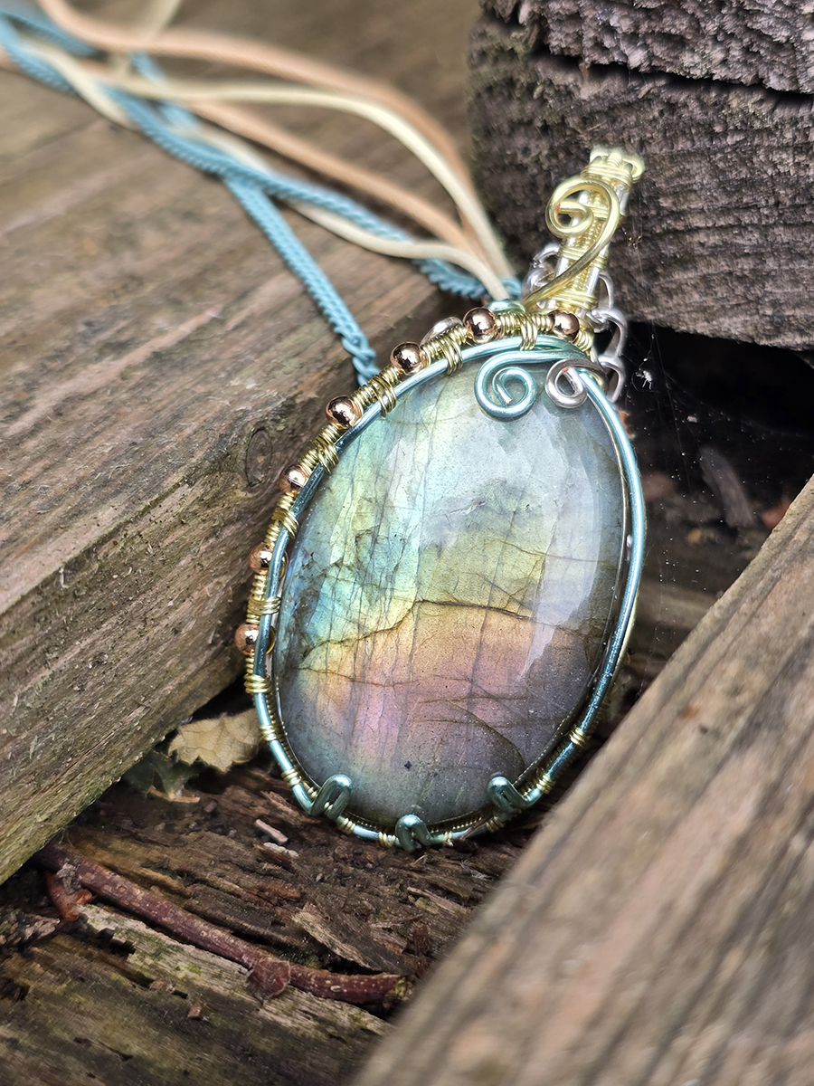 Un régal total que cette grande labradorite (4 cm) et ses teintes exceptionnellement douces, dégradées du vert tendre au violet en passant par du jaune, de l'orangé, c'est tout simplement une pierre eceptionnelle. La monture est la plus discrète et peu couvrante possible, en cuivre teinté vert pâle et doré clair, quelques petites billes couleur or rose pour accompagner.