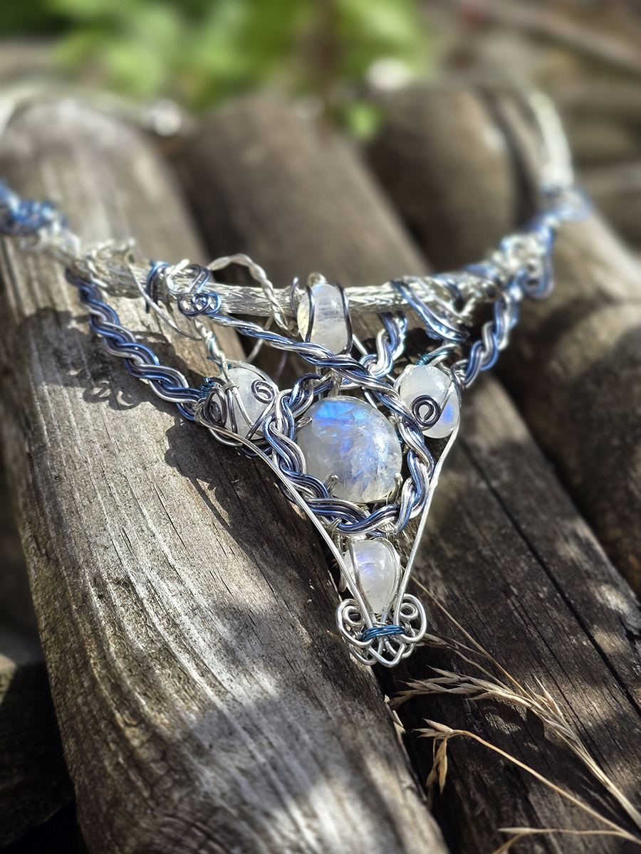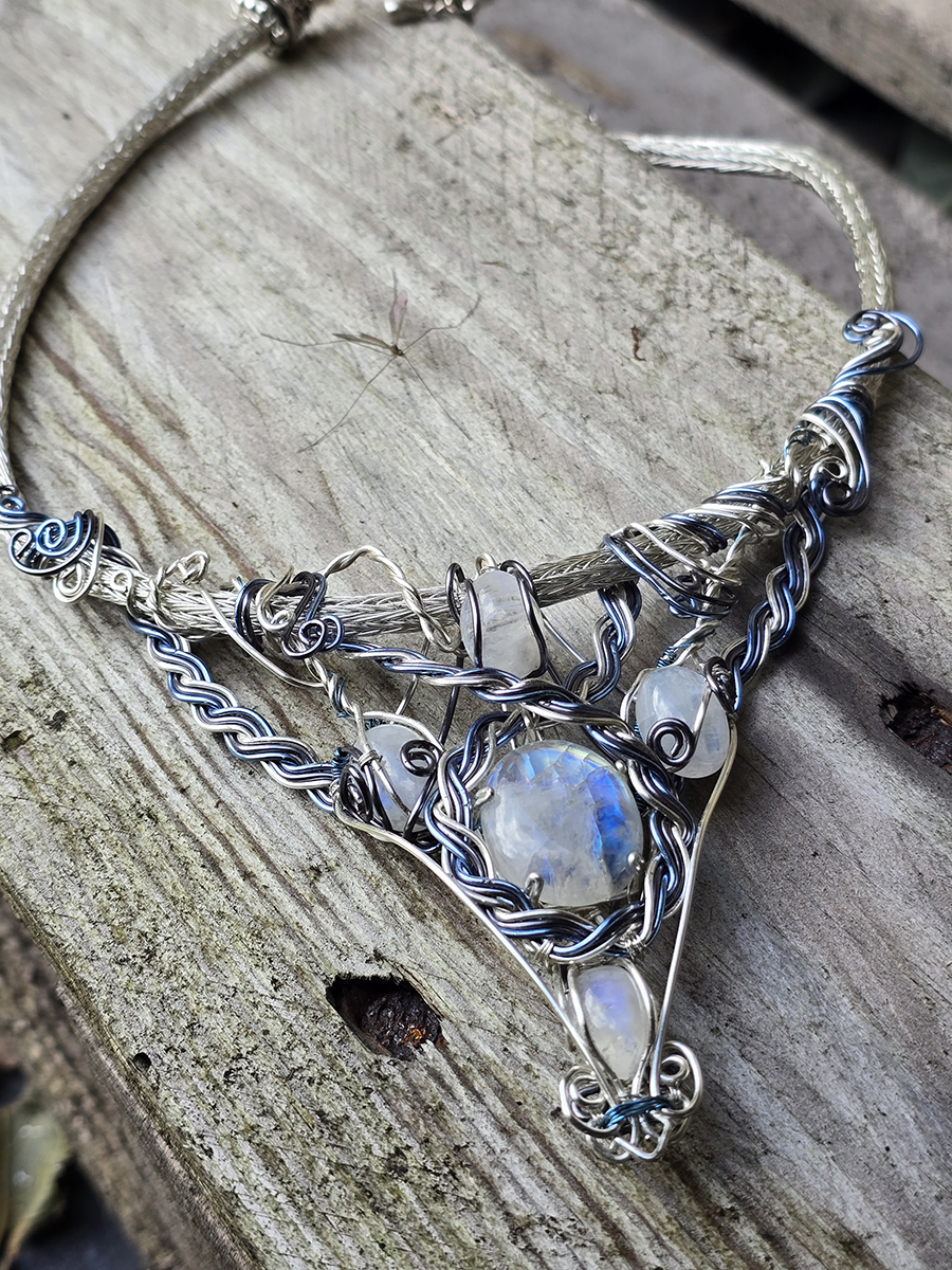 Le tressage du collier est évidemment fait main, en cuivre teinté argent, comme la monture qui s'agrémente d'un peu de bleu clair et de gris pour contraster un peu.